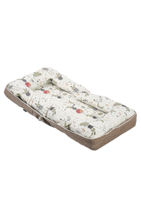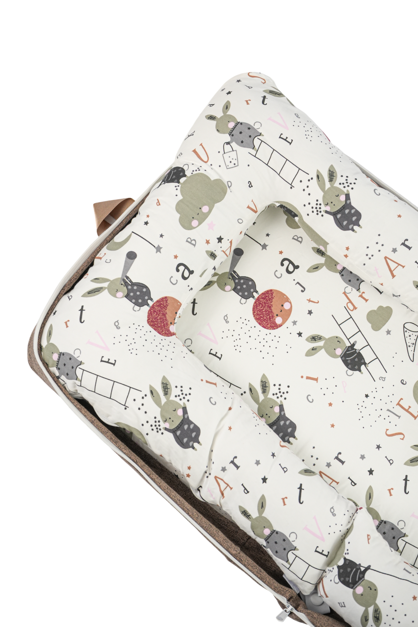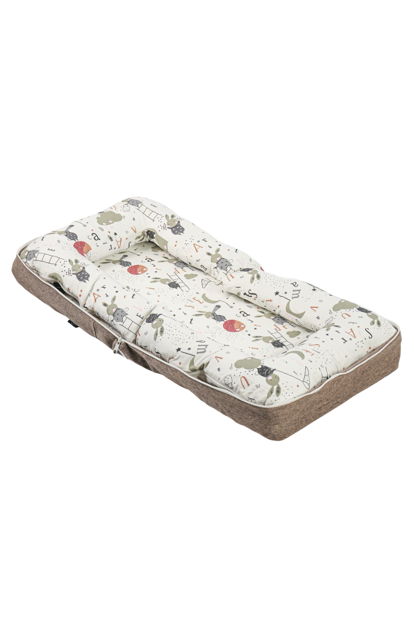 The soft, white fabric cover is printed with playful cartoon animals and alphabet patterns in pastel greens, grays and red accents, creating a cheerful, stimulating environment for baby. The mattress features a plush, cushioned interior with a central fold‑over design that supports proper positioning, while the sturdy brown fabric base adds durability and stability.