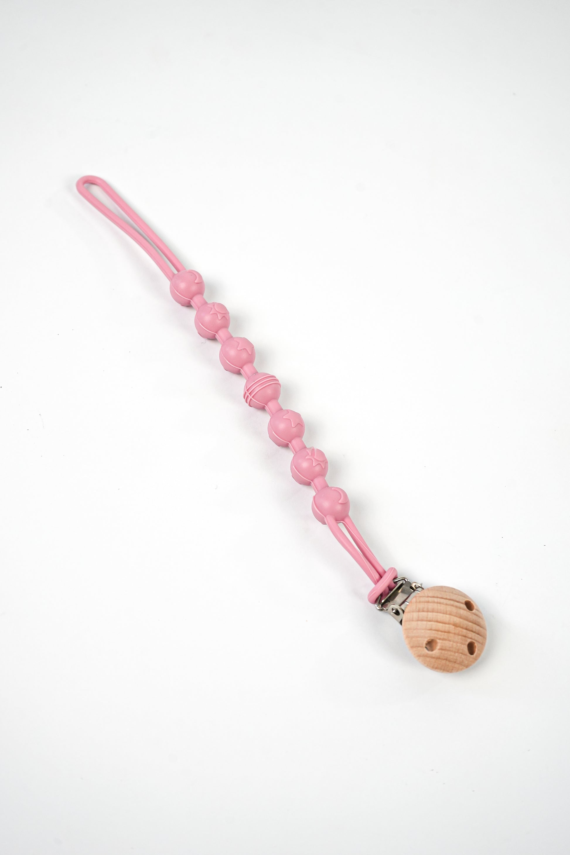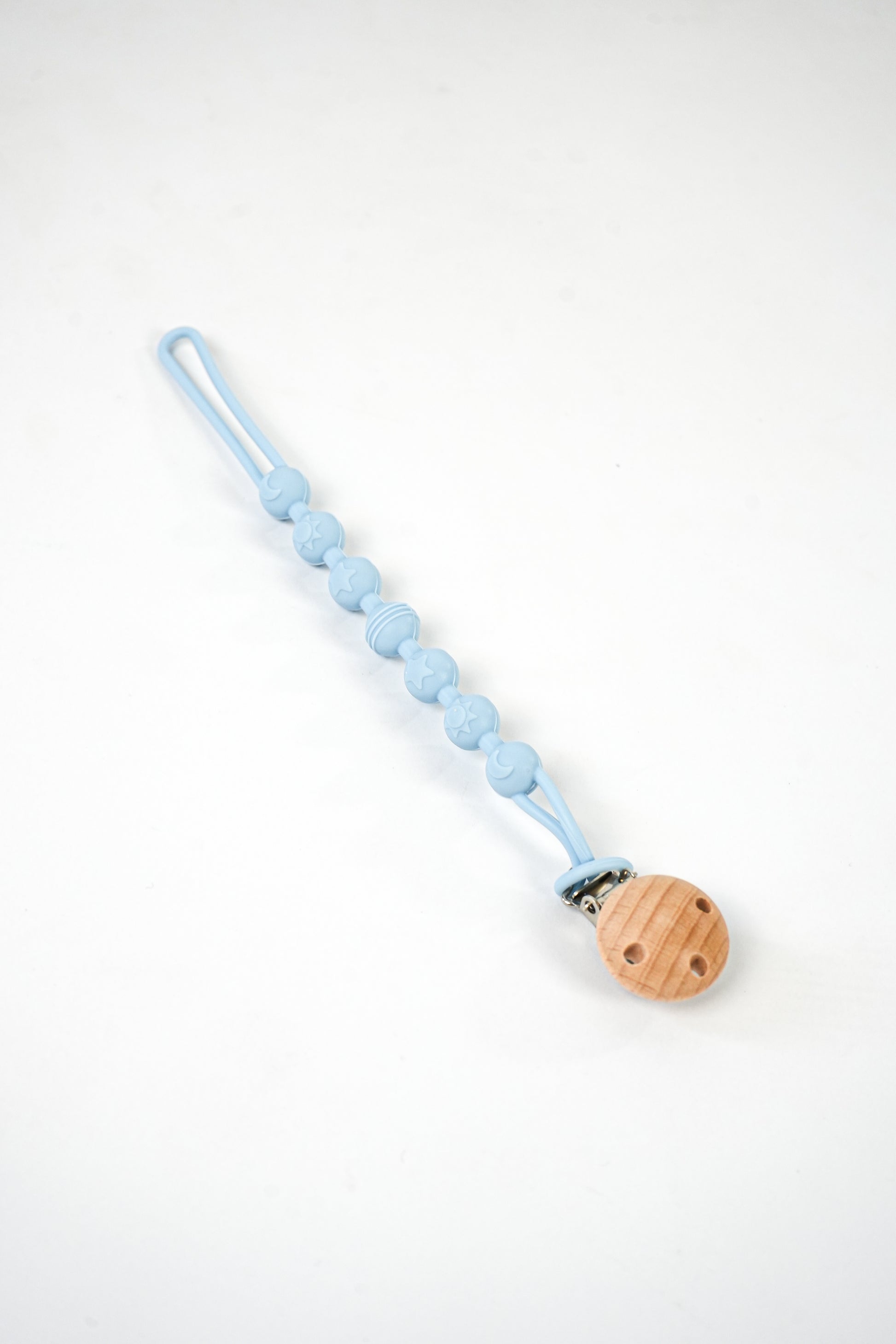 Our pacifier clip is the perfect solution for busy parents and curious little ones. This pacifier clip is safe, stylish and easy to attach to baby’s clothing. The silicone beads are a soft to touch, chewable and provide a soothing sensory experience for teething babies. This pacifier clip does not only keep pacifiers within reach but also doubles as a teething accessory.