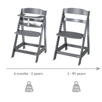 This 3-in-1 adjustable wooden baby high chair grows with your child and can be used from 6m-3 years with or without the tray and up to 10 years as an every day chair.