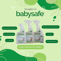 Snuggletime BabySafe Starter Pack - 4 Pack What is Baby Safe Cleaning? Baby Safe products are made with 100% ALL NATURAL INGREDIENTS – making it not only safe for baby but the whole family. • Eliminates odour causing bacteria • All natural bio formulation is completely safe for baby and the whole family • No chemicals • 100% Biodegradable • Environmentally friendly • Non-toxic • Non asthma sensitive • Pet friendly • PH neutral • Non allergy sensitive • Natural colourants & fragrances • Eradicates harmful organisms PLANET, HUMAN AND PET FRIENDLY Set includes: 1 x Snuggletime BabySafe Bottle & Teat Cleaner and Sanitiser 500ml 1 x Snuggletime BabySafe Nursery and Toy Cleaner & Sanitiser 500ml 1 x Snuggletime BabySafe Dustmite & Bedbug Inhibitor 500ml 1 x Snuggletime BabySafe Pacifier Cleaner & Sanitiser 100ml